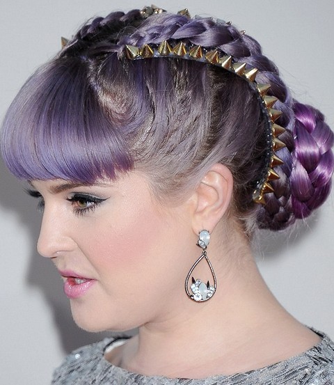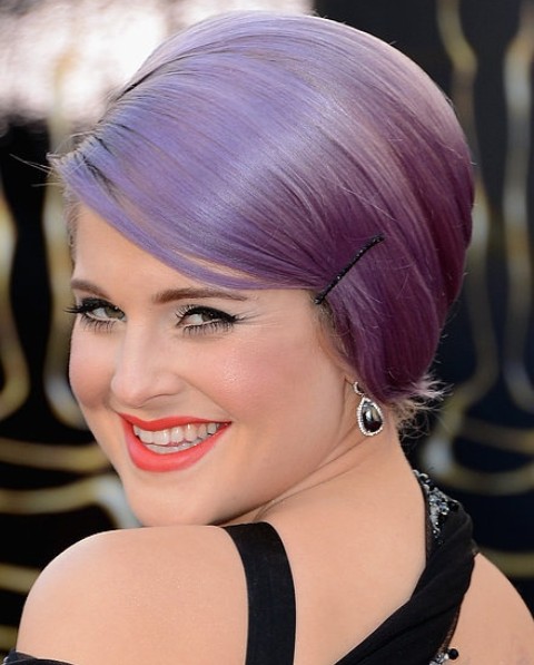 Kelly Osbourne styles her purplish hair into a bun on the crown. The fluffy strands that have been left behind on purpose add life to the hairstyle. This is really a fun yet trendy look.