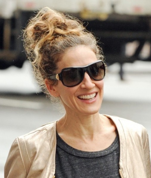 Sarah Jessica Parker combs all her curly tresses up and style a funny updo. The hairstyle is fluffy and casual.