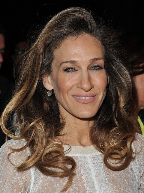 Sarah Jessica Parker highlights her long straight hair and pulls locks into a side. The curly ends add a more edgy look to her.