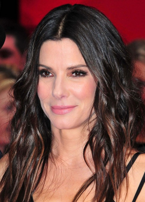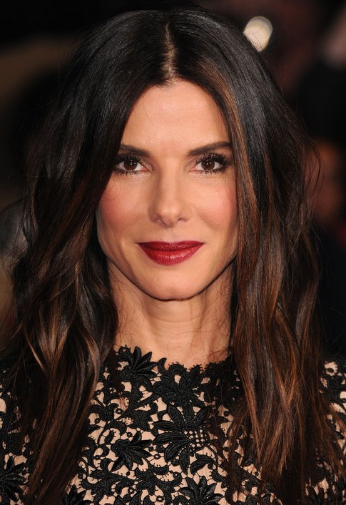 Sandra Bullock wears her long hair in a wavy hairstyle with center part. The highlighted locks are falling down freely over her shoulder. The hair is a good match for her bright red lipstick. To recreate the hair, what is important thing is to add the highlights.