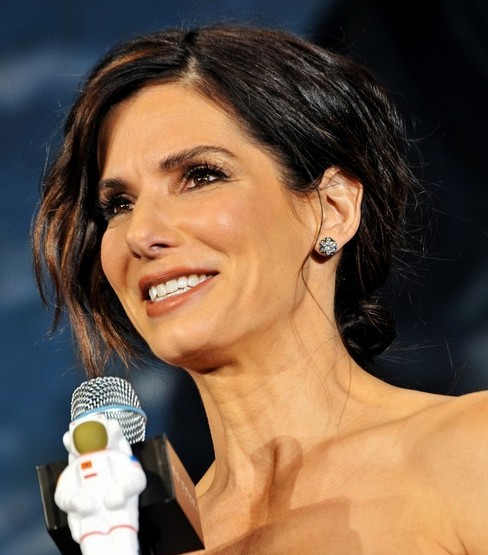 Sandra Bullock pins up her brown locks low at the nape with face-rounding strands falling down. The hair is a good match for her complexion.