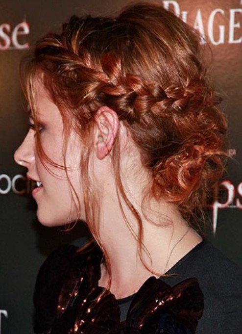 Kristen Stewart’s braided updo is shiny not only in the auburn hue, but also in the style. Kristen Stewart makes a braid round her crown and twists the rest locks at her nape. She also leaves some strands down to silhouette the face.