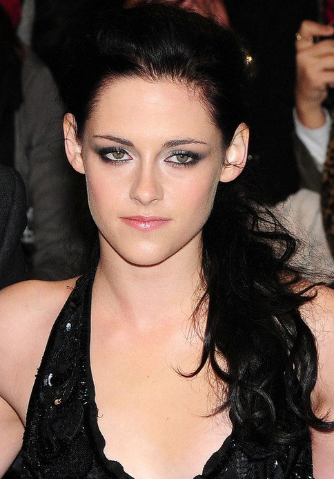 Kristen Stewart wears her long raven hair in a curly hair ‘do with deep side part.