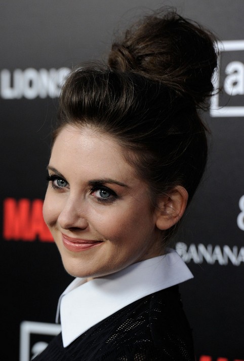 Alison Brie teases up the locks and piles a loose bun on top. The hair works with her outfit and eyeliners perfectly.
