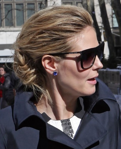 Heidi Klum styles her long hair in a classic updo. The updo is easy to copy by sweeping all the locks back and making a simple bun.