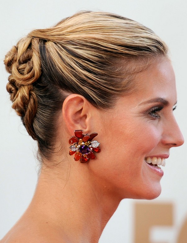 Heidi Klum sports a pinned updo for her look. She combs her hair back to make a sleek side part, tucks the locks behind her ears and pins up the ends. When you try the hair ‘do out, you can have your hair highlighted and use the right hair products.