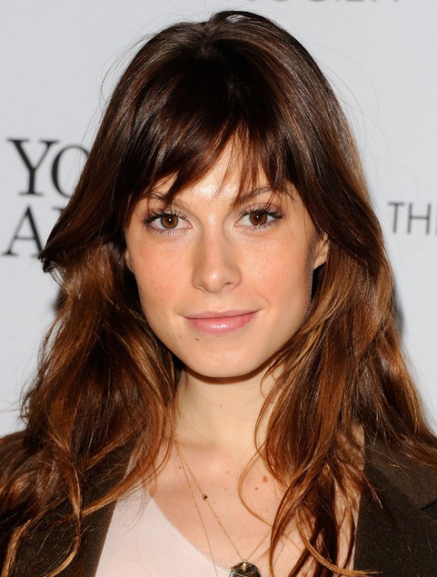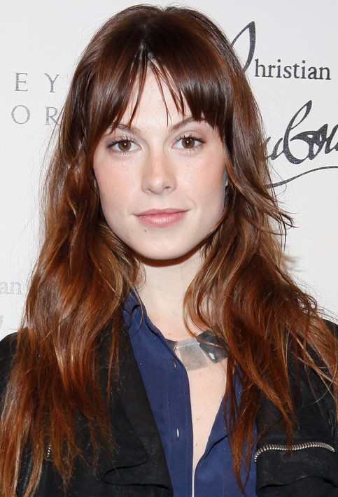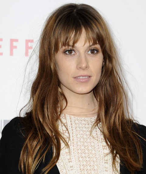 Elettra Wiedemann has her long hair done in a layered hair and curls the brown ends. The swept bangs complete the layered hair ‘do perfectly.