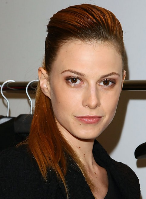 Elettra Wiedemann sweeps the locks back, including the bangs and makes a hair knot for the look. The hued hair matches her complexion well.