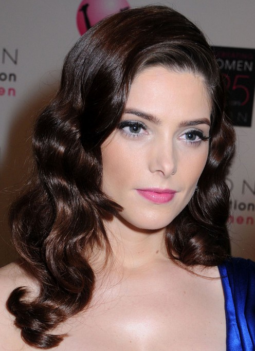 Ashley Greene keeps a retro look with a side parted curly hair ‘do. She gives her wine-red hair luxurious curls and sweeps the deep side parted bangs that obscures half of her face to bring a sexy look.