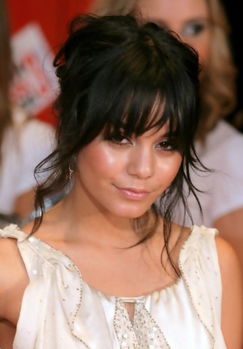Vanessa Hudgens has her long hair done in the bobby pinned updo. She twists her black tresses into a nape-height updo leaving the short locks as the bangs.