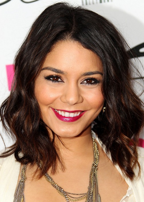 Vanessa Hudgens shows a good hairstyle for the brunettes who have medium length hair. She just adds enough waves to the ends in order to make a textured feel. Also, her center part can highlight her slightly make-up.