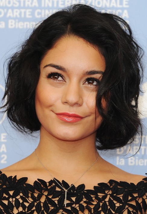 Vanessa Hudgens rocks her short bob with tousled waves. It’s a raven ‘do with side part. It’s suitable for brunette women under 30.