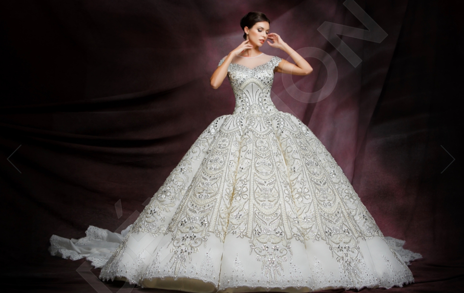 A gown worthy of Cleopatra herself, this gorgeous wedding gown embellished with Ancient motifs stands out thanks to its purity of line and exquisite décor. The almost-invisible sheer bodice in combination with the mermaid silhouette makes this gown a sight to behold.