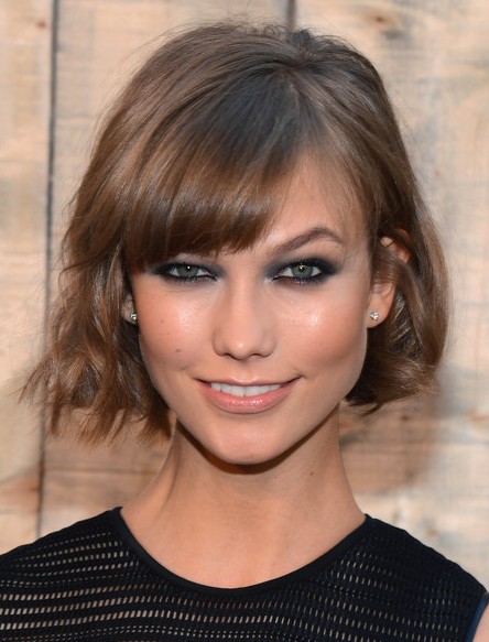 Karlie Kloss Short Hairstyle – Cute short wavy bob hairstyle with side swept bangs