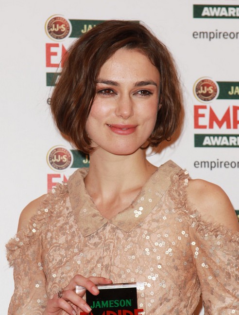 Keira has got the balance of hair, makeup and gown just right in this red carpet picture, showing a very happy face! The bob is all one-length with an untidy, blurred parting in an off-centre position for a casual look. The subtle medium copper-brown shade is complemented by copper eyeshadow and suits Keira’s brown eyes and skin tone perfectly. And against this simple natural style, Keira’s peachy-beige gown with ‘glass’ sequins and ruffled edges completes this young and pretty image.