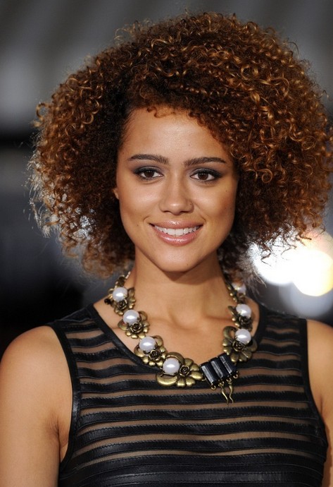 Doesn’t her hair look gorgeous in these fabulous twist-out curls! This haircut shows an expert cutting technique that has created an almost sculpted look and a totally asymmetrical shape. It’s fresh and flattering – adding amazing height and volume at the sides, but styled to place Nathalie’s pretty face right in the centre. The coppery-gold highlights add warmth and really accentuate the beautiful spiralling curls that have such fabulous depth and texture!