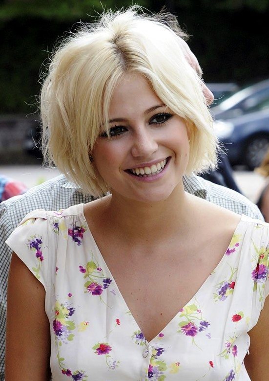 Pixie Lott short hairstyle – center parted blonde wavy bob hair