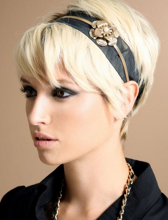Urban chic is still at the forefront of short hair fashions and this artificial bleached-blonde pixie cut has plenty of ‘street’ style! The long fringe touching the eyelashes makes the look casual and the layered cut is shaped down beautifully into the nape, where dark roots create added color dimension. However, this urban look has been dressed up for a special occasion with a contemporary black and gold hair accessory. The black gauze hairband decorated with a thin gold strap and a plastic gold flower is the perfect addition to an edgy young look where old-fashioned cuteness is not required!