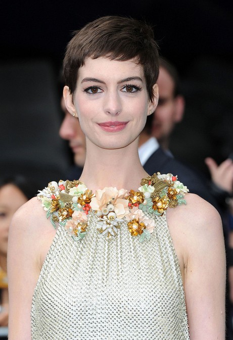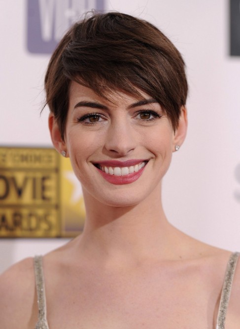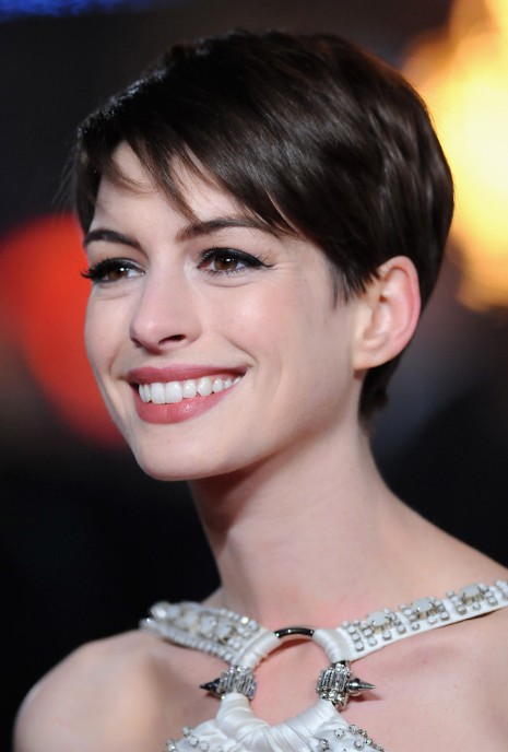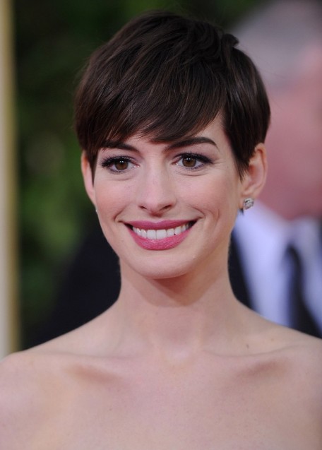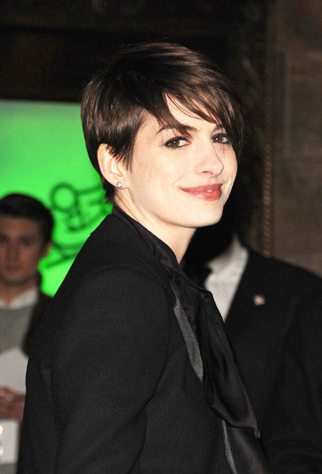 Anne Hathaway Adorable Short Pixie Cut with Side Swept Bangs – Short Hairstyles 2014 /Getty Images