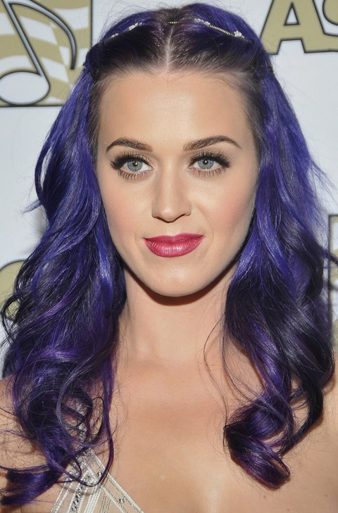 Kat Perry Hairstyles: Center-parted Purple Curls