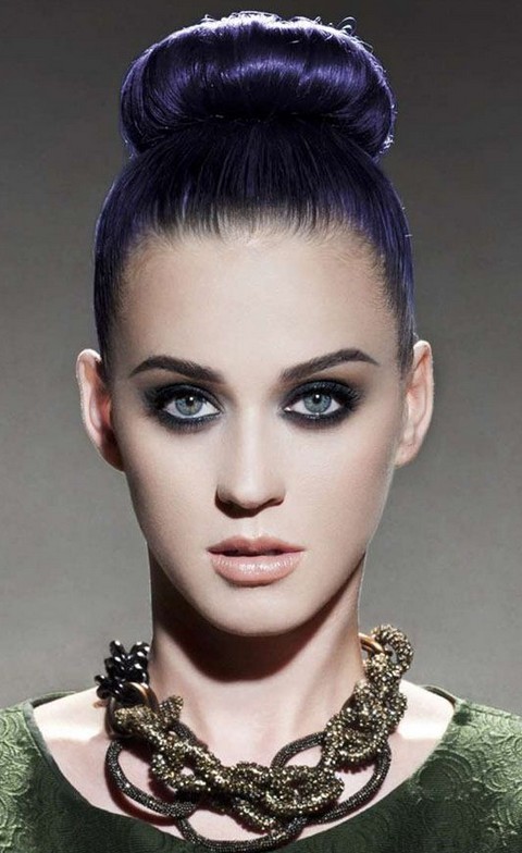 This classic is quite fascinating. It’s so sleek and tidy that Katy looks exquisite with it. Although it’s a simple high bun, the purple hair color makes it stand out. So, try to add some color to your hair, and you will find it can be more amazing.