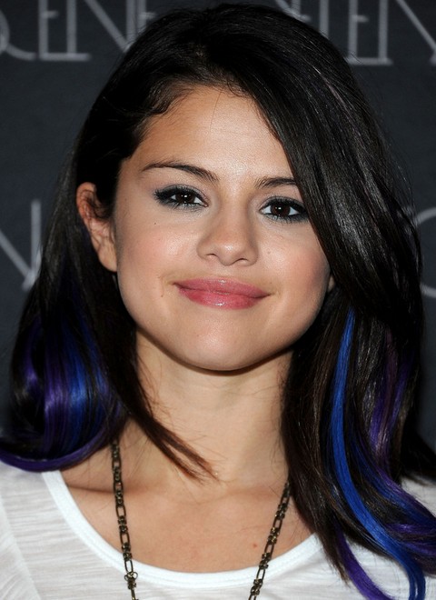 Selena is edgy-chic with this side-parted haircut. She sweeps her bangs aside, which makes her so cool. The dark blue highlights make the hairstyle distinctive from the ordinary straight haircut. Show off your unique fashion statement with your favorite highlights!