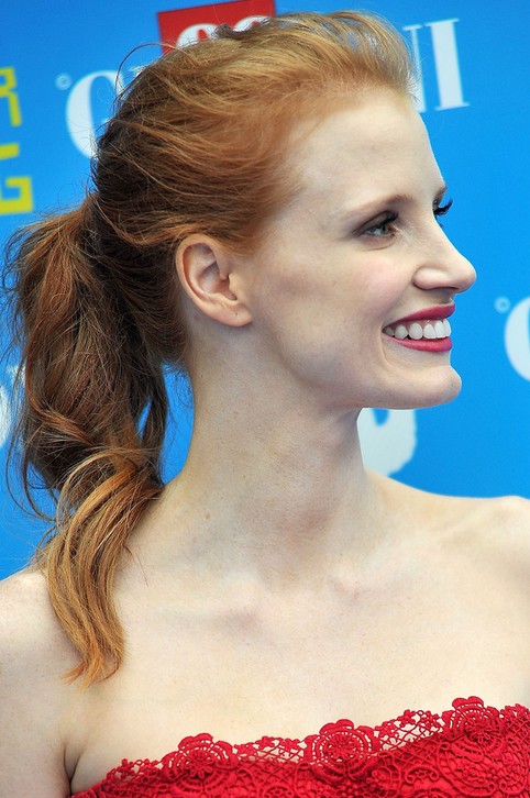 Jessica Chastain’s silky tresses make up this fluffy ponytail. The hairstyle is disheveled and sassy.
