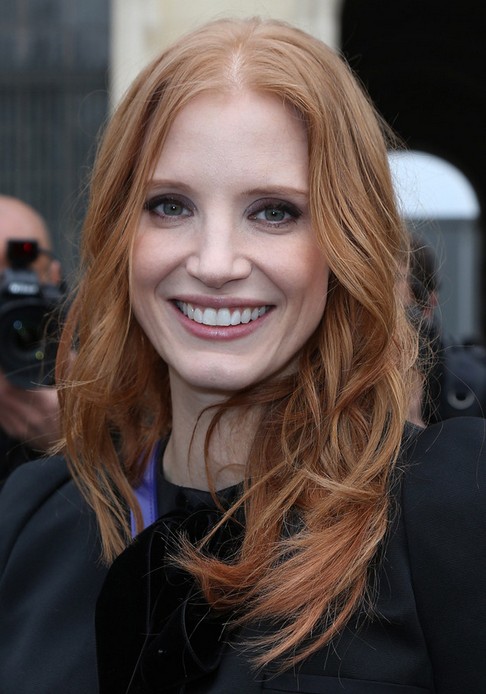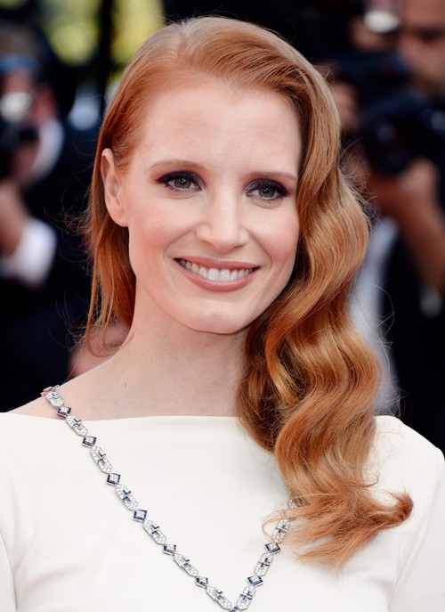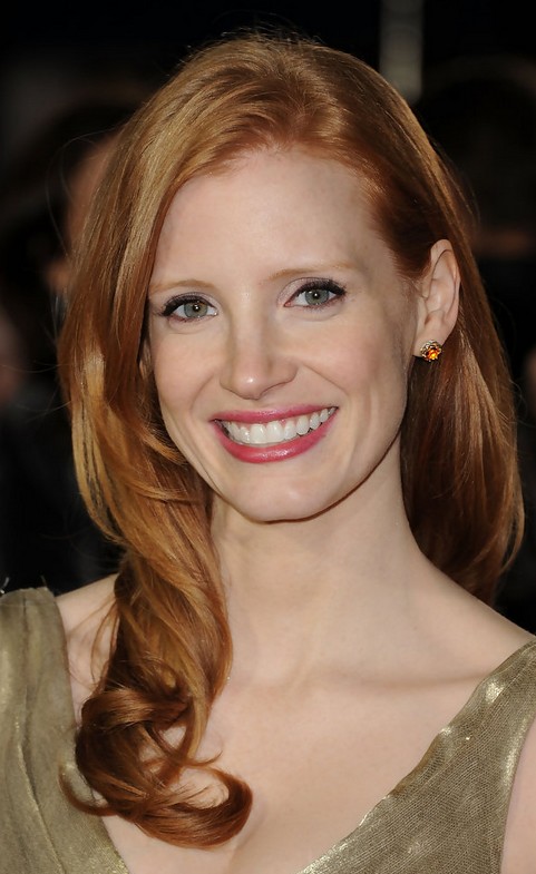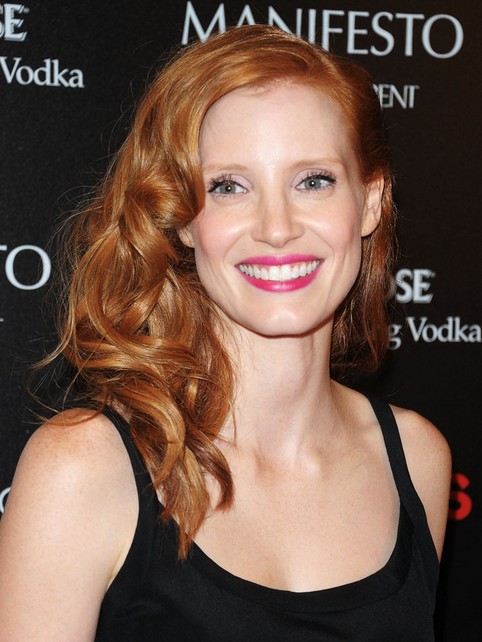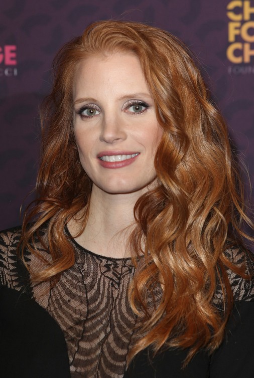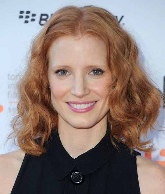 Jessica Chastain looks great in her strawberry waves with central part. The messy curly ends frame her face perfectly.