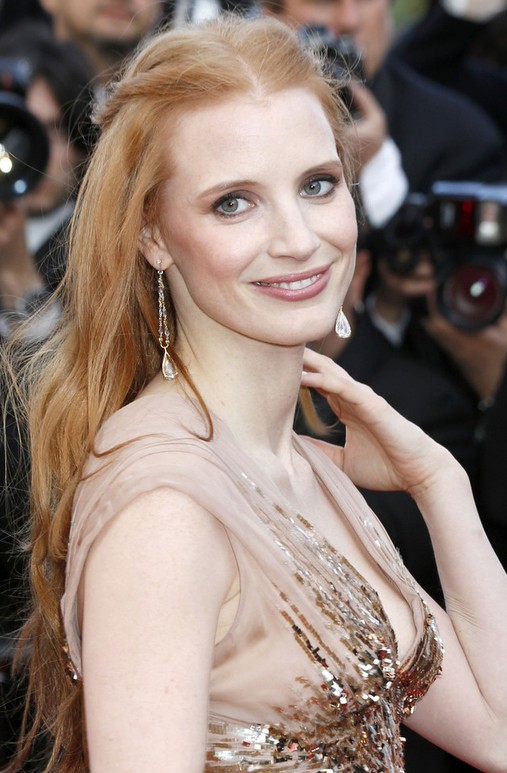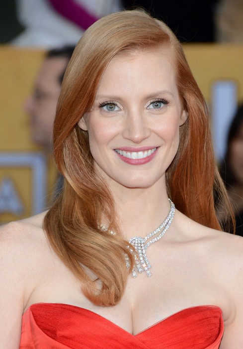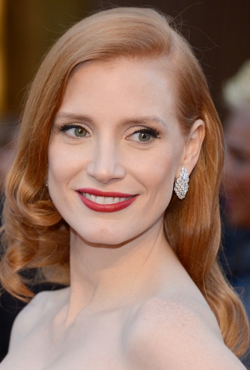 Jessica Chastain is extra beautiful in a red hair with slicked-back sides. The hair is radiant and she is bright.